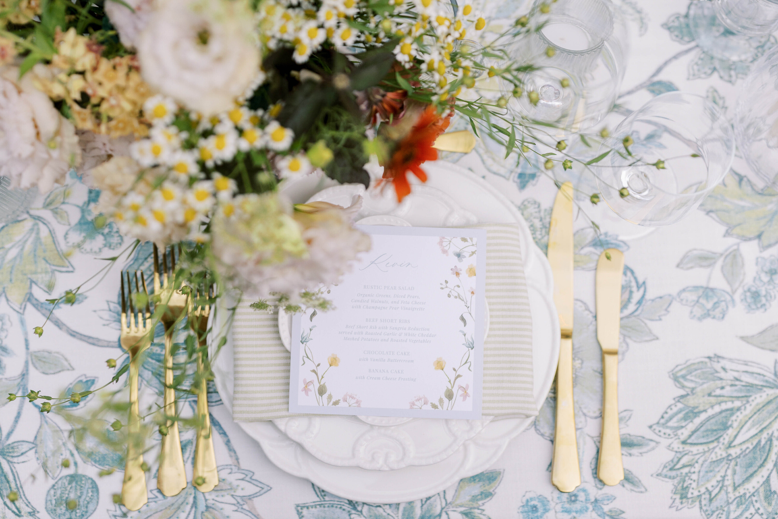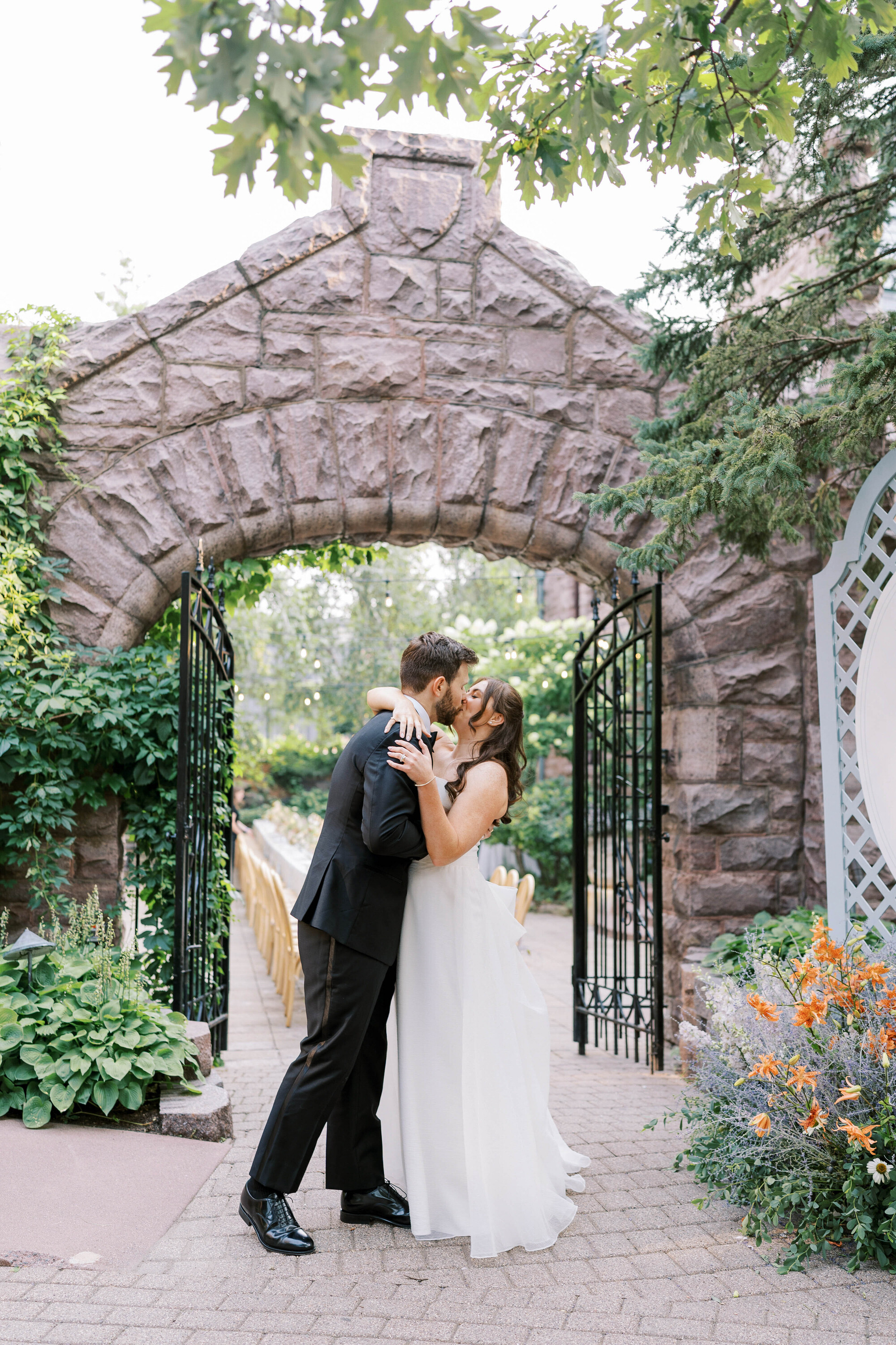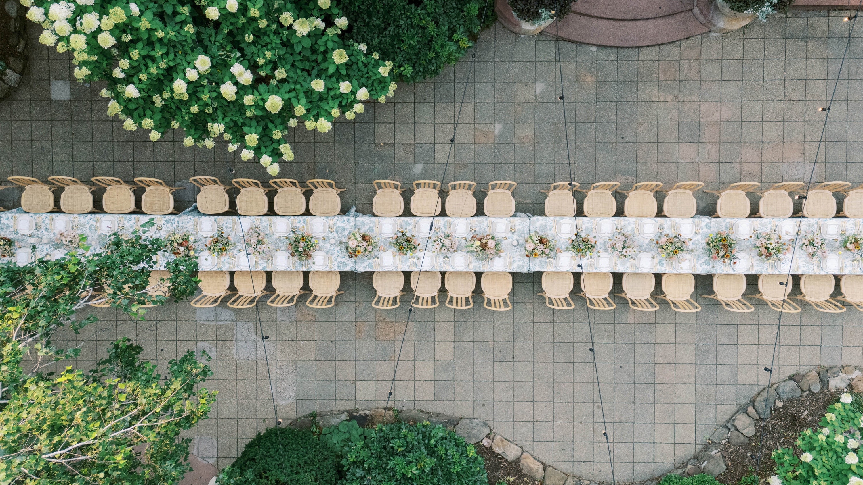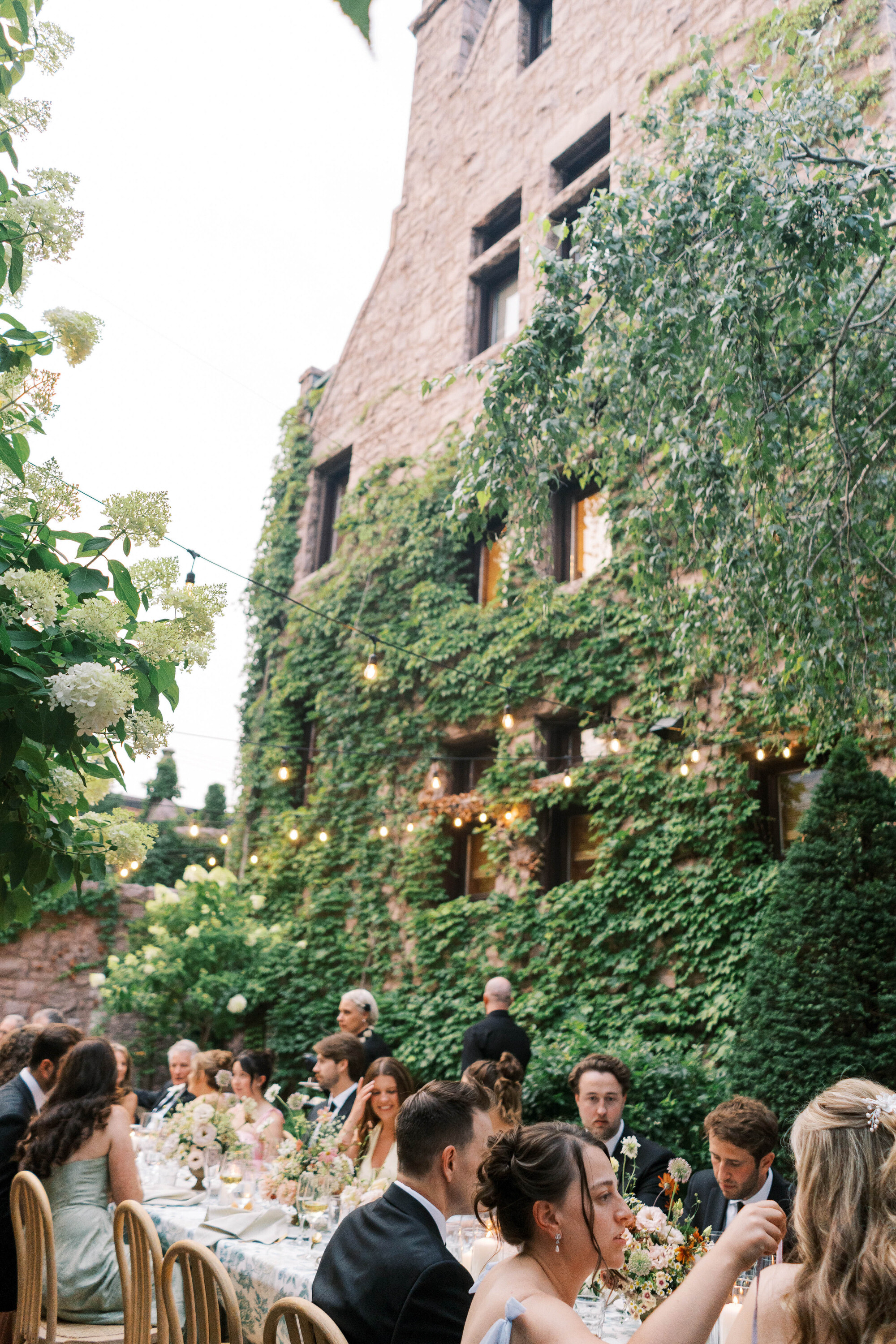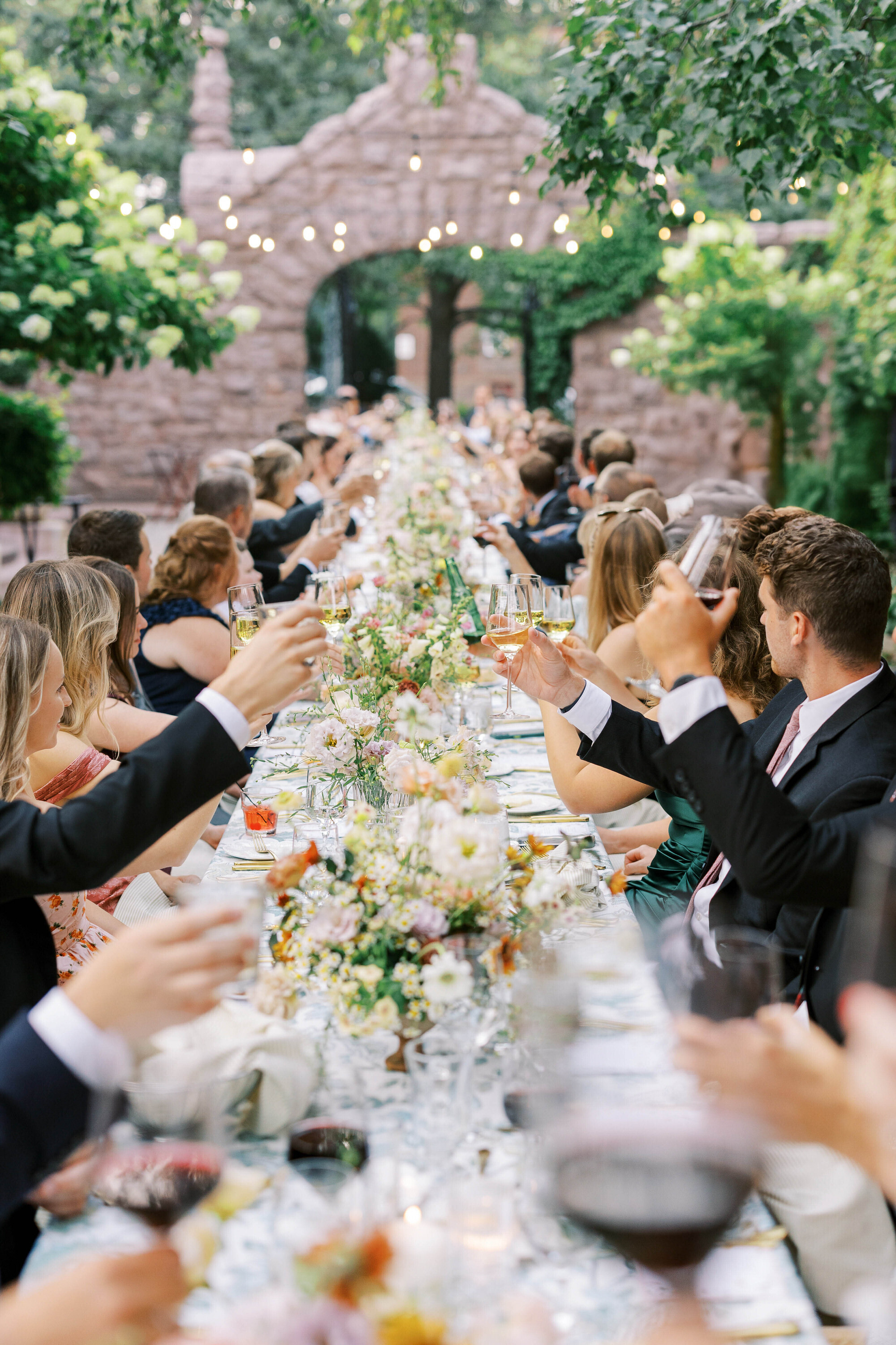 After a timeless ceremony at the University of St. Thomas Chapel, the newlyweds returned to the mansion for an unforgettable courtyard reception. Through the gates of Van Dusen Mansion awaited a stunning sight — one long harvest table, set beneath the lights and ready to welcome all of Sarah and Dillon’s favorite people.