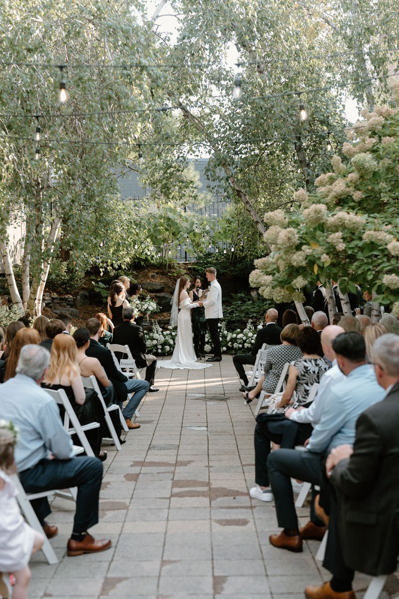When it comes to creating a romantic atmosphere for your special day, no setting can match the feeling of courtyard weddings. From the moment your guests arrive, they will enter the courtyard through the most amazing and unique wrought iron gate surrounded by the mysterious and historic Van Dusen Mansion. They will be awe-inspired by the towering ivy-covered stone walls and elegant twinkling cafe string lights that drape across the courtyard. A truly romantic setting whether you choose to say “I Do” at a daytime ceremony or nighttime under the stars.